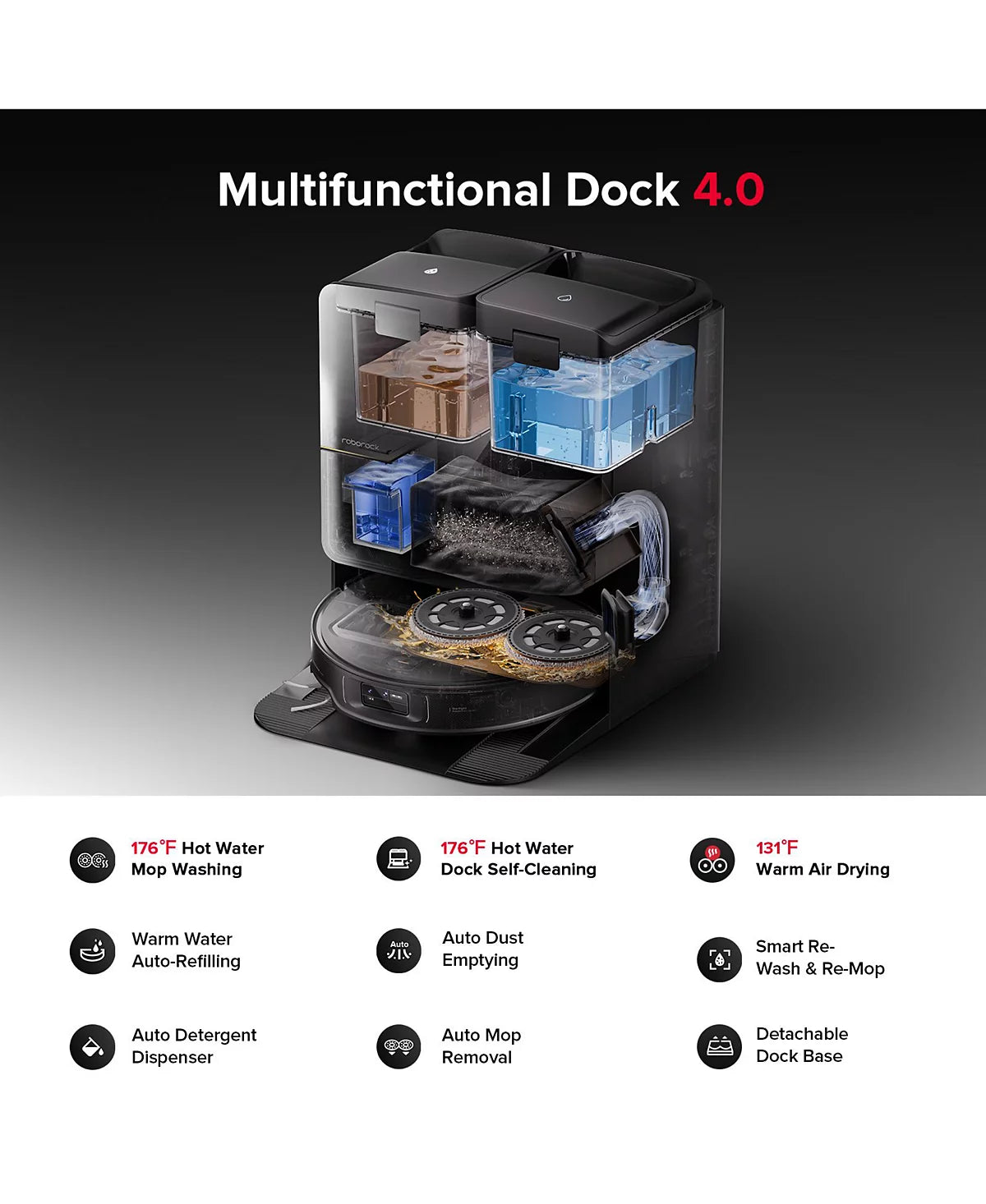 - 10-in-1 Multifunctional Dock 4.0. The dock features 176°F hot water mop washing, 176°F hot water dock self-cleaning, automatic mop removal, auto detergent dispensing, smart re-wash and re-mop, 131°F warm air drying, and up to 7-week auto d